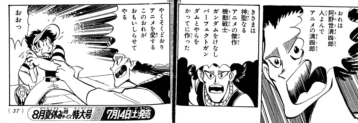 今回は二分割無い感じの値段っぽい? 現在、絶賛作業滞りな状況が物理的な障害として存在しているため とにかく情報の取りこぼしをしないようにとやってますが 近年とにかく増える増える。 とりあえず、公式の大全が出来る限り頑張って載せてくれればいいや… と2013の巻き返しを見て思ってるところではあるんですが、 まぁ 死んじゃう前には端っこのものでいいから形にしときたいですなぁ… と 一昔前に大風呂敷広げて宣言しちまった立場としてハンケチぐらいのサイズの布を広げて言ってみる うん、良かったね って作品。 作品発表時の "設定やネーミングなどにこんなおかしな部分がかいま見える作品だからなにか弾けたことをしてくれるハズ" を確かに表してくれてた。 ホビーアニメによくある「その作品の主体であるモノ(この場合はガンプラがそう)で世界を救う」的なこともやらなかったしね。 結局『プラモ狂四郎』や『ガンプラビルダーズ(主にD)』がやってた "おもちゃで大人も子供も一生懸命に真剣に遊んでいる"っていう 傍から見れば"お前らバカかよ"っていうことを最後まで貫いてくれたのはむしろすごいとすら思った。 「バカを真剣にやっている」ってのがどれだけ面白いのかはガンダムシリーズでは『Gガン』が過去に見せてくれたことだし、(真剣なのにバカみてぇ、なんてのは『W』とかでも見せてくれてる) 現実世界でもバカみたいなことを真剣にやってるからこそ起こる「笑い」に言及してる人もいますしね。 商売が絡んでるとどうしてもいろんな部分でどんどんエスカレートさせていく筈なのに 結局主役機の決め技は基本2つで貫き通したり(まぁ、2クールっていう尺の問題もあるんでしょうけど) 人によっては物足りないと思う人もいるんでしょうけど、過剰に供給するよりは腹八分目の方がなんかいいんだなと思えます。 というか、ところどころ理詰めされてない部分があるんだけど、こういうところも視聴者側がなんとなく想像で埋められるようにあえて放置してるんでないのかな、ってすら思えたり。 (昔のアニメなんかは大抵そうでしたよね、ガッチガチの設定や劇中描写でなく、作劇の中でなんとなくこれはこうなんだって見せるやり方) 毎週の放送が楽しみで、最終回を迎えるのが名残惜しい作品はかなり久々でした。 しかも、ソレがガンダムだったワケだし。 売上とかの数字としてのデータよりも市場的な(主にガンプラの)品薄現象とかを実際に垣間見た上で、最終回を迎えた今の評判の良さからも、続き、もしくは二期をぜひっていう意見がやはりあちらこちらで垣間見られますが もし、続編が作られたとしてもそのまま続くんではなく別の場所の別のキャラクターたちでやって欲しいというのが自分的な希望ですね。 作品として綺麗にまとまったのもあるんですが、世間でよく言われる"アリアンが大変なことになったよ、たすけてー"的続きは完全に蛇足でしょ。 放送中の展開も何度か「よくある展開を覆す」ことをしてましたが、視聴者の想像力と同レベルの作品見せられてもあんま嬉しくないんですよね。 覆してくれてこそワクワクするし楽しいというのに。ホビーアニメではコテコテの「世界の危機にふたたび立ち上がる!」展開発想は阿呆の考えかと。 まぁとはいえ、ガンプラで事件を解決出来るようなことが起こるにしてもあちらにガンプラなんてビギニングと壊れたミスサザビー、あとモックしかないんだし、ハナから変な話に思えるんですがね。あと、凄腕の元ビルダーが二人いるんだしなんとか解決できるようにも… (まぁ、個人的にはガンプラで解決できる事件事態が起こるような展開がいやなんですけどね。最終回のでかい結晶体の展開はイレギュラーとしても) あと、なんていうのかなぁ、 作品のキモであるプラフスキー粒子がこちらの世界でなんとかなっているのなら、互いの世界への干渉って実はそんなに遠い未来の話じゃなくなってる いつかは堂々とお互い会えるよね、っていう部分からすると なんか騒動が起こったから再会っていう展開はあの最終回迎えた上ではどうにも… そういえば 話の展開にギャーギャー言ってる人相手に "「レイジが居なくてもこんなにファイトがうまくなったよ」っていう『ドラえもん』の最終回みたいなのがえぇんかい" って某画像掲示板で書き込んだことがあったんだけど ニュアンスが少し違えど当たってましたっけ いや、悪いってんじゃないんですよ。 ただ、王道展開には違いないんだよなーと ともかく 2クールの間わくわくさせてくれた「ガンダムビルドファイターズ」を作ってくれたスタッフの方たちには感謝。 『プラモ狂四郎』のラストカットを引用させてもらいます
